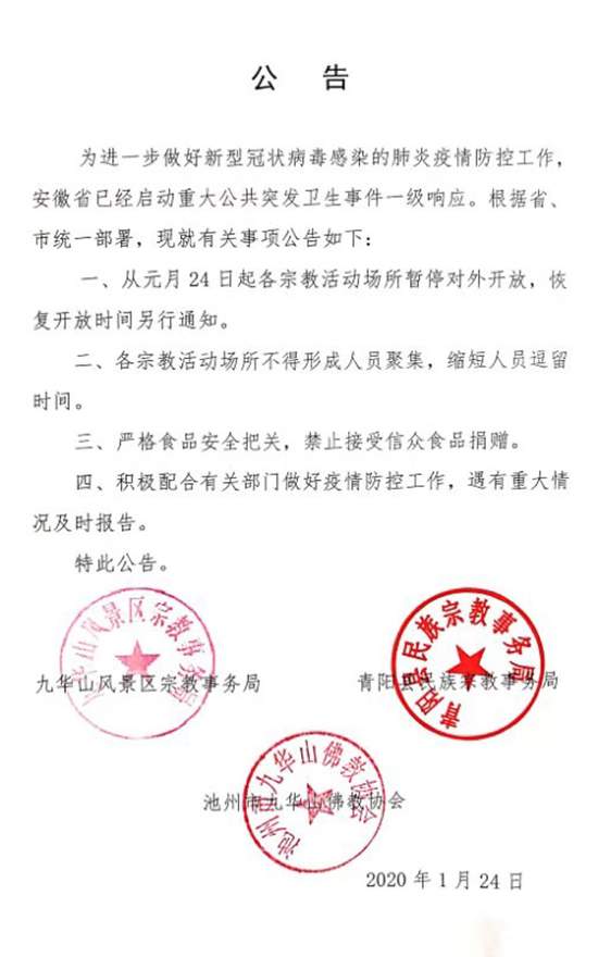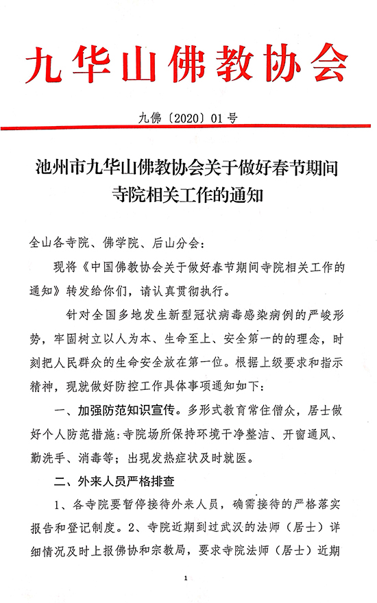 九華山佛教協(xié)會發(fā)布《關(guān)于做好春節(jié)期間寺院相關(guān)工作的通知》,“通知”要求,全山各寺院、佛學(xué)院、后山分會針對全國多地發(fā)生新型冠狀病毒感染的嚴峻形勢,牢固樹立以人為本、生命至上、安全第一的理念,時刻把人民群眾的生命安全放在首位。